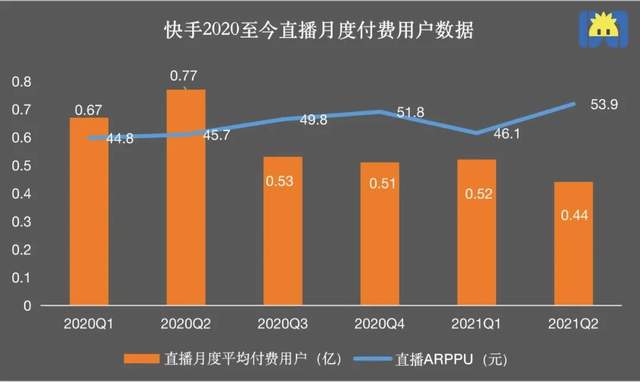 直播业务的 ARPPU(付费用户平均收入)整体增速已趋于平缓。虽然因快手今年二季度推出“直播蓝海计划”,截至 2021 年 6 月 30 日,合作公会数量同比增长近 400%,主播们短期吸引用户付费打赏,ARPPU 值稍有上升,但由于增加了公会的分成,快手的直播收入出现新低。根据“直播收入=付费用户数×ARPPU”的公式,驱动直播收入增长的两大因素都表现乏力。