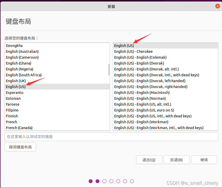 接下来这步选择的是键盘布局。我们使用的布局是美国标准的,所以都选择English(US)。