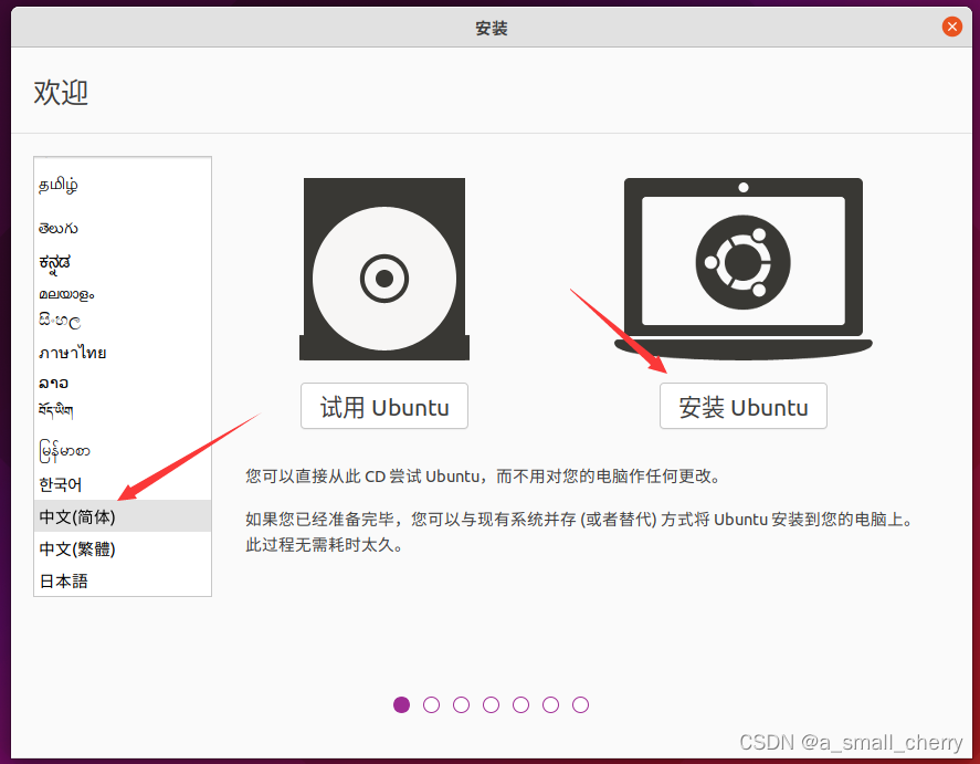 选择「安装%20Ubuntu」。左边的语言选择,是指系统语言,选择中文(简体)。