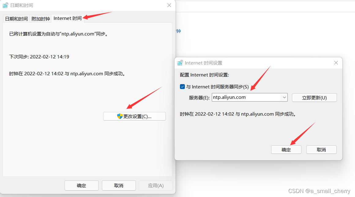 在Internet%20时间设置对话框里,选择与Internet时间服务器同步,填写一个阿里云内网NTP服务器地址ntp.aliyun.com,并单击立即更新,确定。