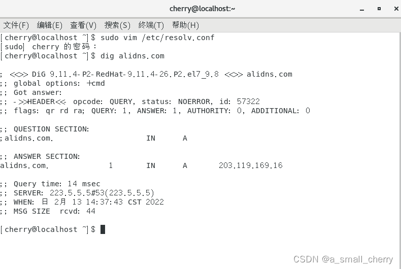 若返回结果的server为阿里公共DNS(2400:3200::1或2400:3200:baba::1)则配置成功。