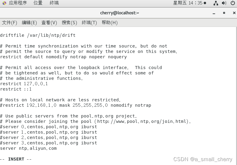 3找到server%20ntp%20服务器%20iburst的信息后,输入i开始编辑文件,给暂时不需要的NTP服务器句首加上#隐藏起来。