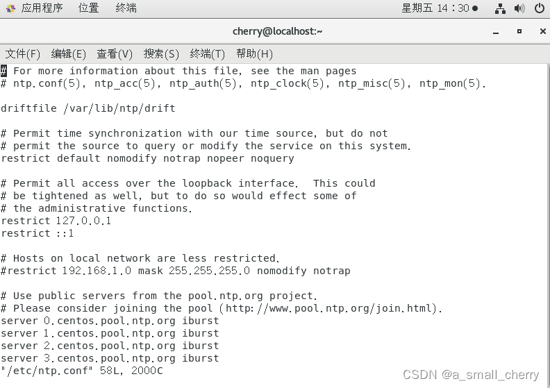 2执行命令sudo%20vi%20/etc/ntp.conf打开并编辑NTP服务配置文件。